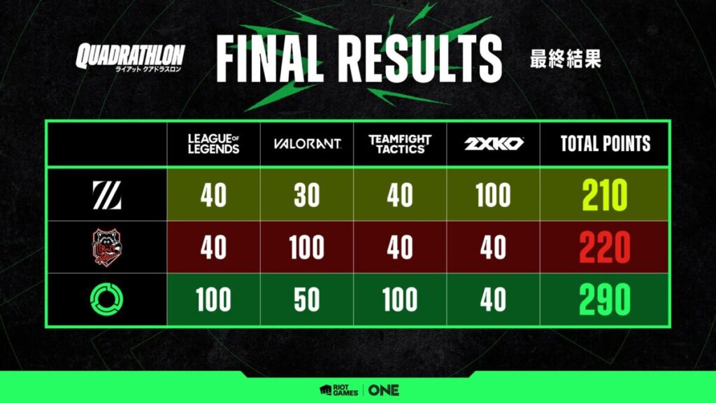 ライアットクアドラスロン開催!3チームがRiotの大人気ゲーム4タイトルを戦い総合王者を目指す。3日間の結果まとめ