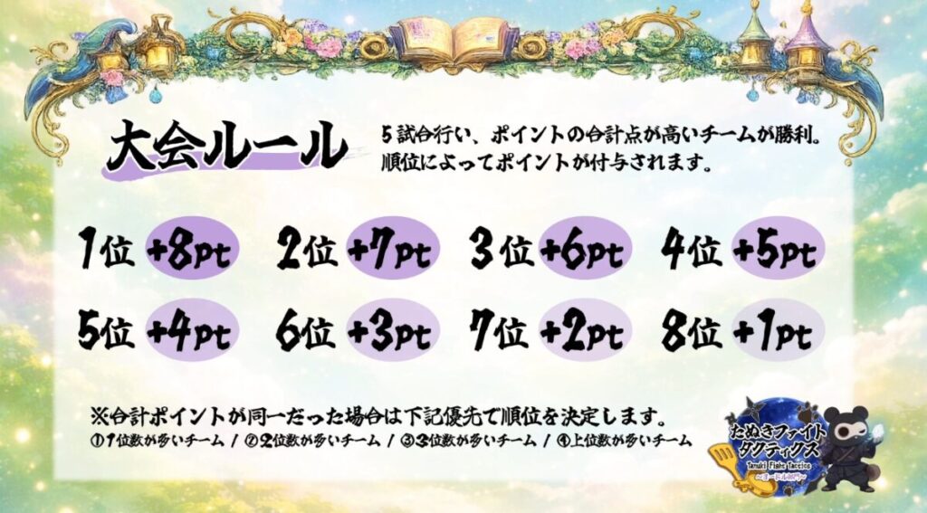 - 合計ポイントが同一だった場合は①1位数が多い②2位数が多い③3位数が多い④上位数が多いチームの優先順で順位を決定